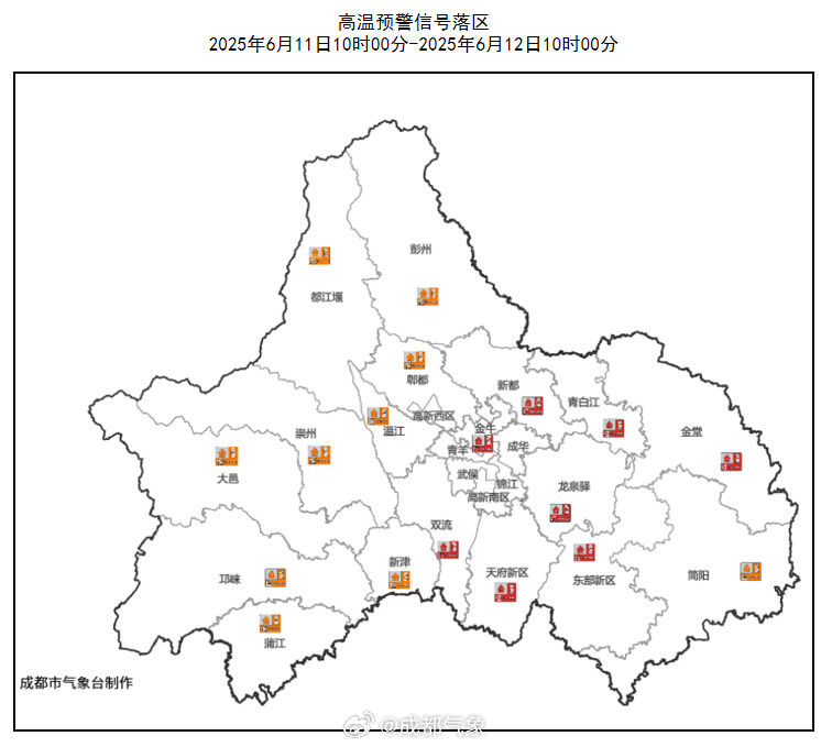 成都市气象台 2025年6月11日10时00分更新高温橙色预警信号为高温红色预警信号: